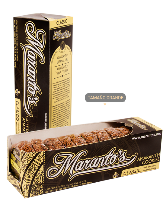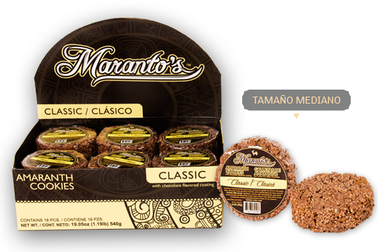 Galleta a base de cereal de amaranto, con una exquisita cobertura de chocolate y hojuelas de maíz.