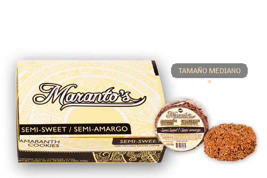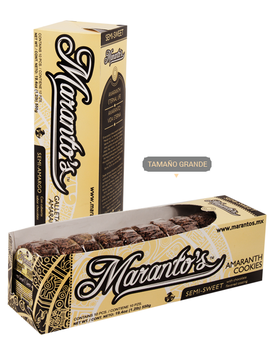 Galleta a base de cereal de amaranto, cobertura de chocolate semi- amargo y hojuela de maíz.